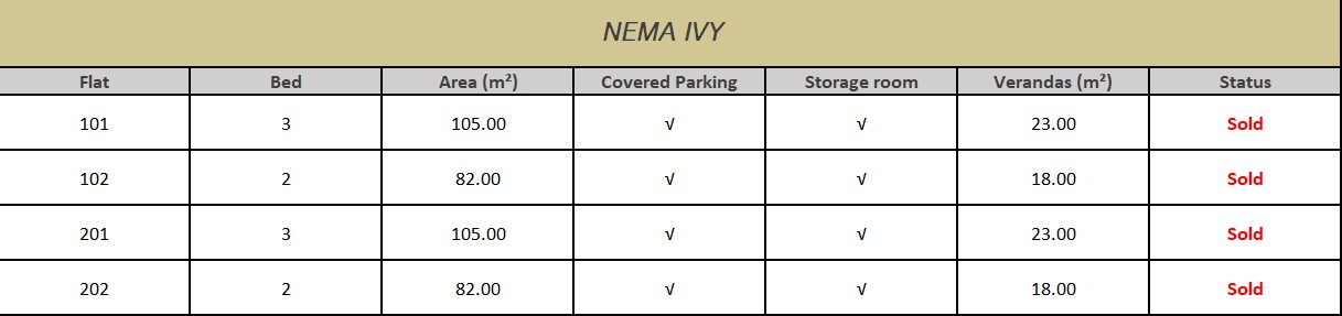 Discover NEMA IVY in Ypsonas, a unique mixed-use project due for completion in Q3 2025. This two-story development offers easy access to the highway and includes two ground-floor shops for rent, alongside four spacious residential units comprising two 2-bed and two 3-bed apartments.